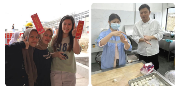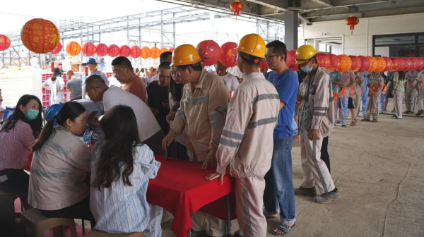 元宵佳节,莫罗瓦利产业基地食堂门前张灯结彩,160张灯谜纸条整齐划一地悬挂在灯笼下面。来自基地各个部门的中印尼员工互相探讨灯谜谜底。微风吹来,谜面随风起舞,两国员工穿梭其间,流连忘返。猜谜结束后,大家纷纷入座食堂,共享元宵。