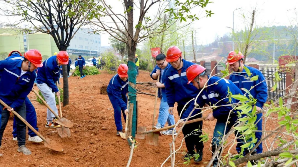 铜仁(上市主体)产业基地工会开展了植树节相关活动,工会领导班子号召广大员工参与到爱护园区环境的行动中,来自原料厂区、材料厂区、环保厂区、职能部门的员工代表参加了植树活动,为园区增添新绿。