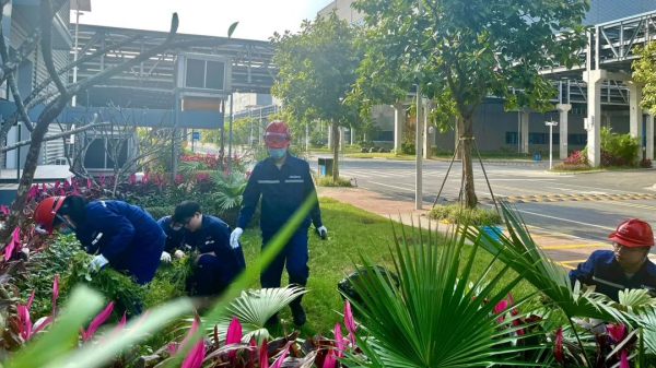 钦州产业基地200名员工齐聚基地办公楼旁,大家按部门分成小组,在小组长的带领下,开展了植树及为绿植浇水活动,倡议全员争当绿色低碳践行者。