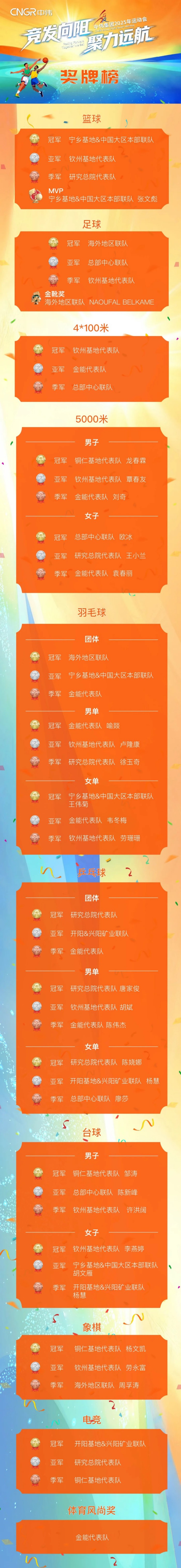 每个代表队都收获了属于自己的荣誉,有时隔一年再度重夺篮球冠军的宁乡基地&中国大区本部联队,有首次征战足球赛便以全胜纪录问鼎冠军的海外地区联队,有包揽乒乓球男单、女单、团体三块金牌的研究总院代表队等等。每个运动员也都满载而归——斩获羽毛球女单三连冠的宁乡基地&中国大区本部联队选手王伟菊,5000米项目三年两冠的铜仁基地代表队选手龙春霖、总部中心联队选手欧冰,更有首次设立的足球金靴奖、篮球MVP奖项——海外地区联队的NAOUFAL BELKAMEL以9粒进球摘得足球金靴,宁乡基地&中国大区本部联队的张文彪以94分当选篮球MVP。