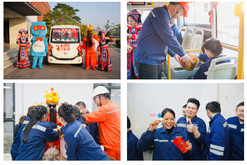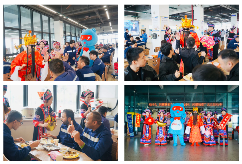 基地形象大使团也迎来了“惊艳首秀”。他们与活泼可爱的“锂电宝宝”、喜气洋洋的“财神爷”共同集结,组成了一支活力满满的送福小分队。在浓厚的节日氛围中,这支“福气天团”通过创意十足的互动与沉浸式文化体验,正式拉开了基地辞旧迎新、共赴新篇的华丽序幕。“互动体验巡游”环节点燃了全场最高热情。员工们争相与“财神爷”大力击掌、拥抱“金元宝”,在响亮的掌声中“掌”握新年好彩头。“接福挑战”更是一场智慧与默契的较量,大家妙语连珠,接力送出“一马当先”的节日祝福。摩洛哥同事也深受感染,热情加入其中,中外伙伴欢聚一堂,在欢声笑语间绘就了一幅跨越国界的文化交融新春图景。