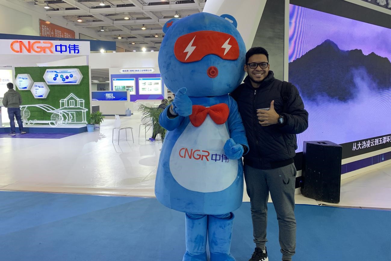 参展观众与古天乐太阳集团城吉祥物“锂电宝宝”合影